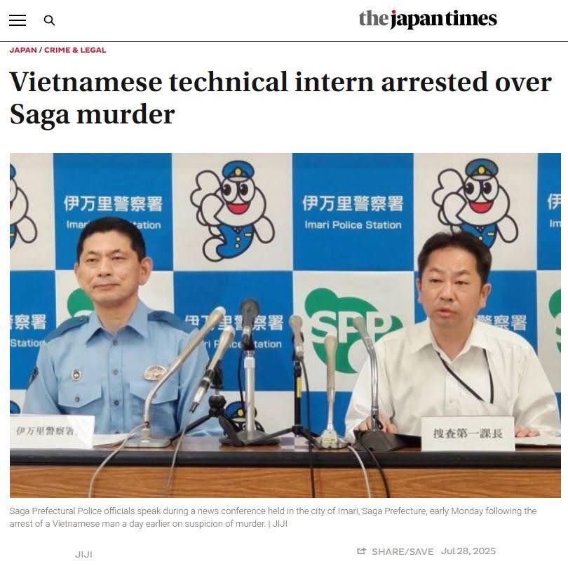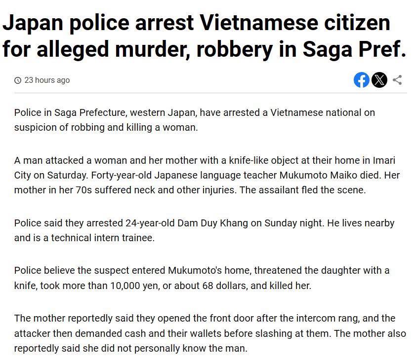 Vụ trọng tội gây rúng động dư luận Nhật Bản mới nhất với nghi phạm là người Việt Nam+ và các dữ liệu thống kê cho thấy người Việt +đang sinh sống tại Nhật đă vượt qua người Trung Quốc và người Philippines.