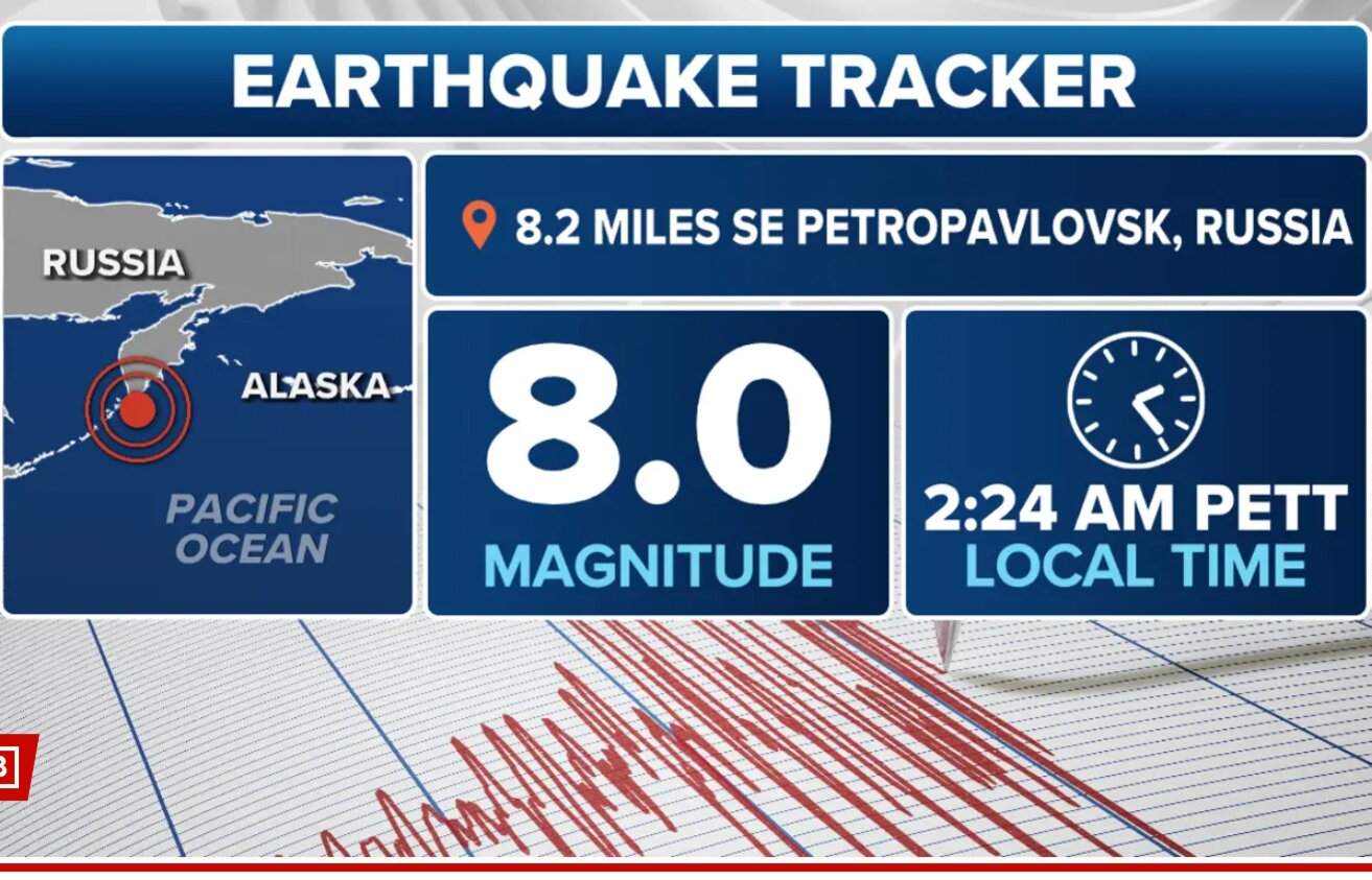 Cơ quan Khảo sát Địa chất Hoa Kỳ (USGS) cho biết một trận động đất mạnh 8,7 độ Richter đã xảy ra ngoài khơi Bán đảo Kamchatka của Nga vào ngày 29 tháng 7, gây ra cảnh báo sóng thần cho toàn bộ Bờ Tây Hoa Kỳ và một phần Quần đảo Aleutian thuộc Alaska.