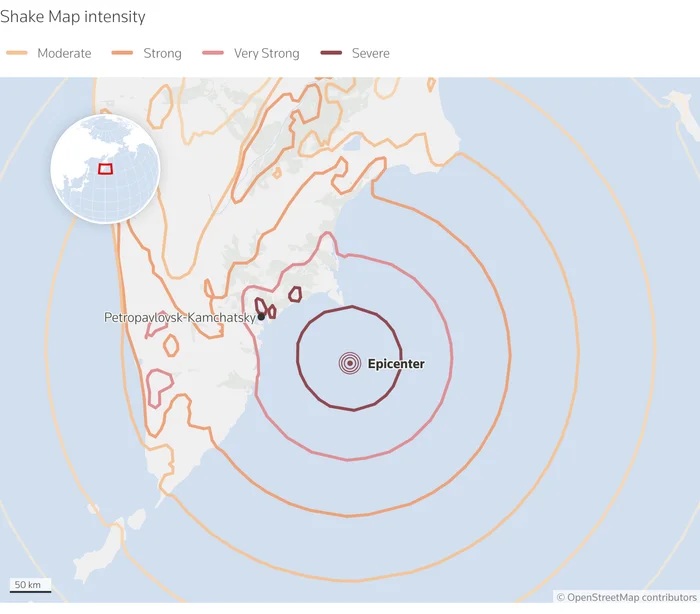 Theo hãng tin Reuters, ngày 30 tháng 7, một trận động đất mạnh 8,8 độ richter đã xảy ra ngoài khơi Bán đảo Kamchatka thuộc Viễn Đông của Nga vào thứ Tư, gây hư hại các tòa nhà và tạo ra sóng thần cao tới 4 mét (13 feet) khiến phải đưa ra cảnh báo và lệnh sơ tán trên khắp Thái Bình Dương cũng như Hawaii, Alaska, bờ biển Hoa Kỳ và Canada, và một số vùng ở Nam Mỹ.