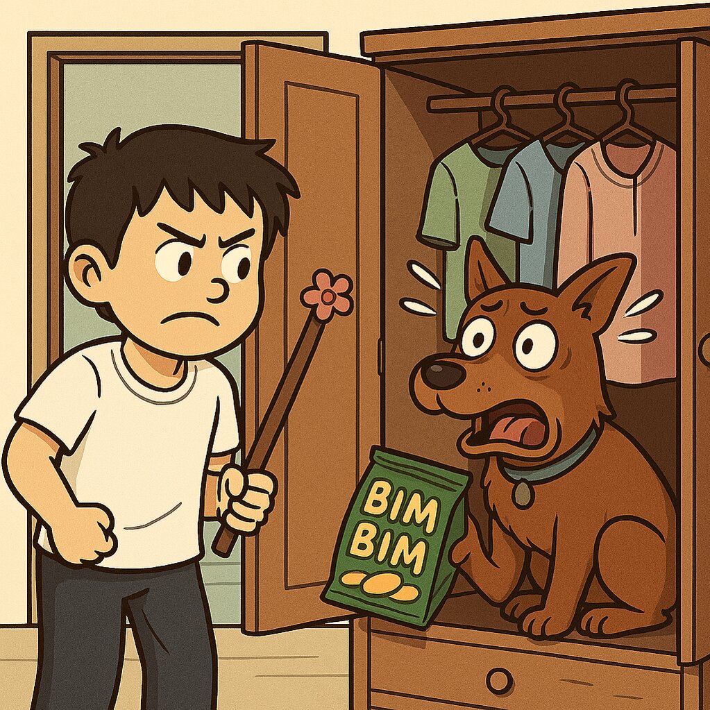 “Nhà em nuôi một con chó tên là Bo. Nó có bộ lông màu nâu, cái tai lúc nào cũng dựng lên như đang nghe tin sốt dẻo. Một hôm bố em cầm cái gậy đi ra sân để chỉnh lại cây cảnh. Bo nhìn thấy, hoảng hốt, tưởng bố định 'dạy dỗ' nên phóng một cái vào phòng. Nó mở tủ quần áo bằng mõm rồi nhảy thẳng vào, nằm cuộn tròn như một cục bông run rẩy. Mẹ em ra thấy vậy tưởng chó bị ma nhập.”