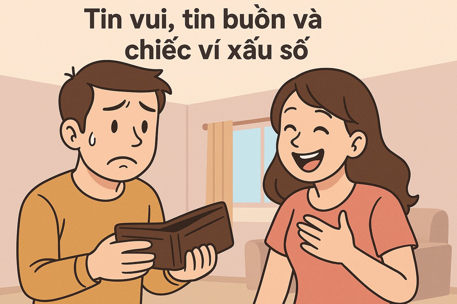 Vợ thản nhiên: — Ha ha! May mà em chỉ cho anh vài đồng tiêu vặt. Anh mất ví vậy em chẳng buồn đâu. Vậy tin vui là gì?