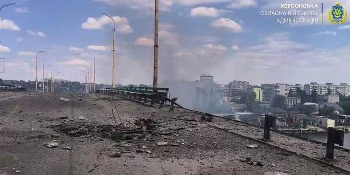 Trong ba ngày qua, lực lượng Nga đã ném bom dẫn đường từ trên không vào cầu Ostrivskyi. Chính quyền quân sự khu vực Kherson công bố video cho thấy một lỗ thủng trên cây cầu.