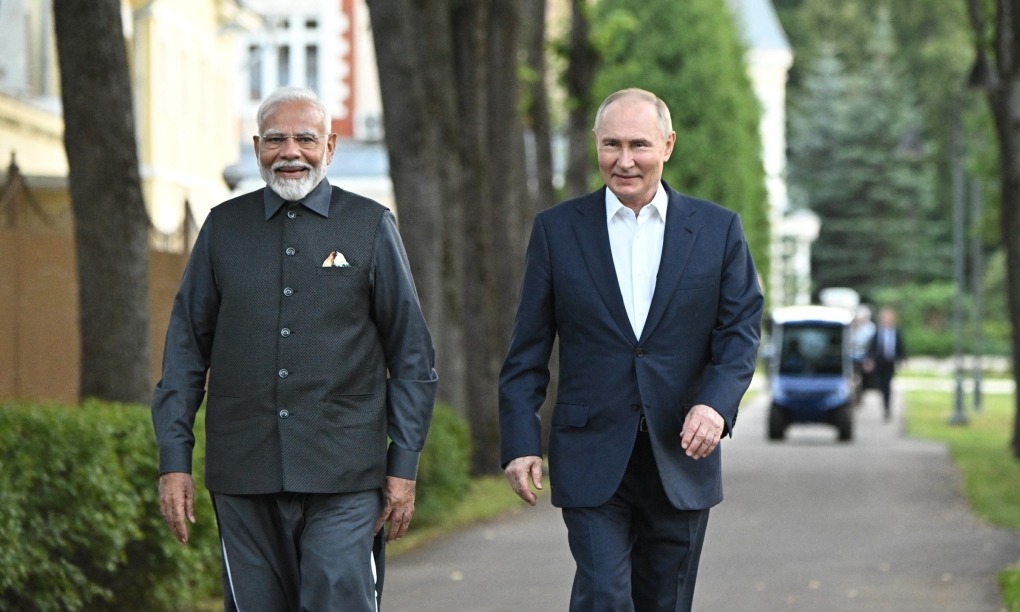 Tổng thống Nga Putin (phải) và Thủ tướng Ấn Độ Modi đi dạo trong dinh thự ở Novo-Ogaryovo, ngoại ô Moskva, ngày 8/7/2024. Ảnh: AFP