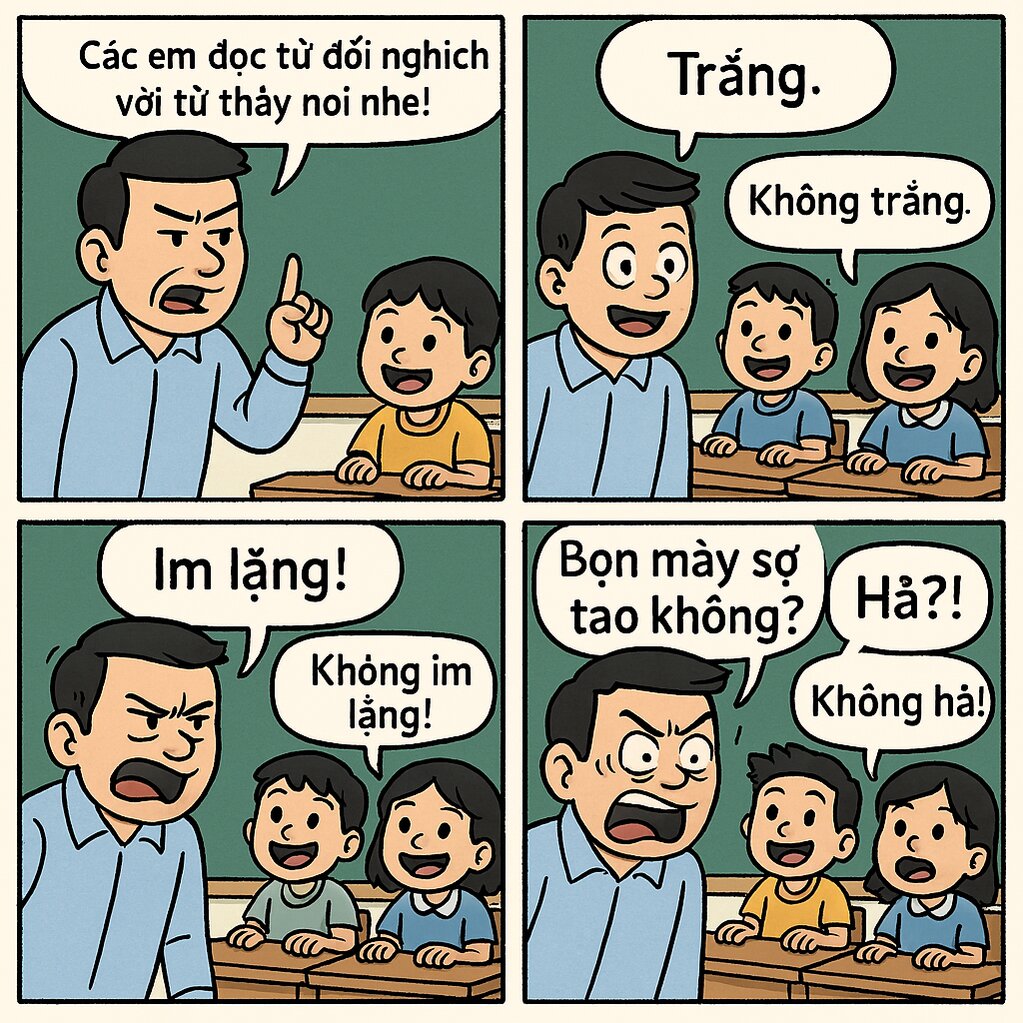 Thầy giáo không thể chịu nổi: Bọn mày sợ tao không? Học sinh vẫn ung dung đọc từ đối nghịch: – Bọn tao không sợ mày! – Hả?! – Không hả!