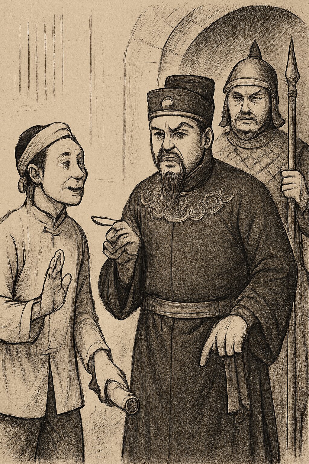 – Dạ, thần bị giam vì dám nhắc quan trả nợ. Có lẽ thần nên học cách quên như quan, để khỏi bị bắt.