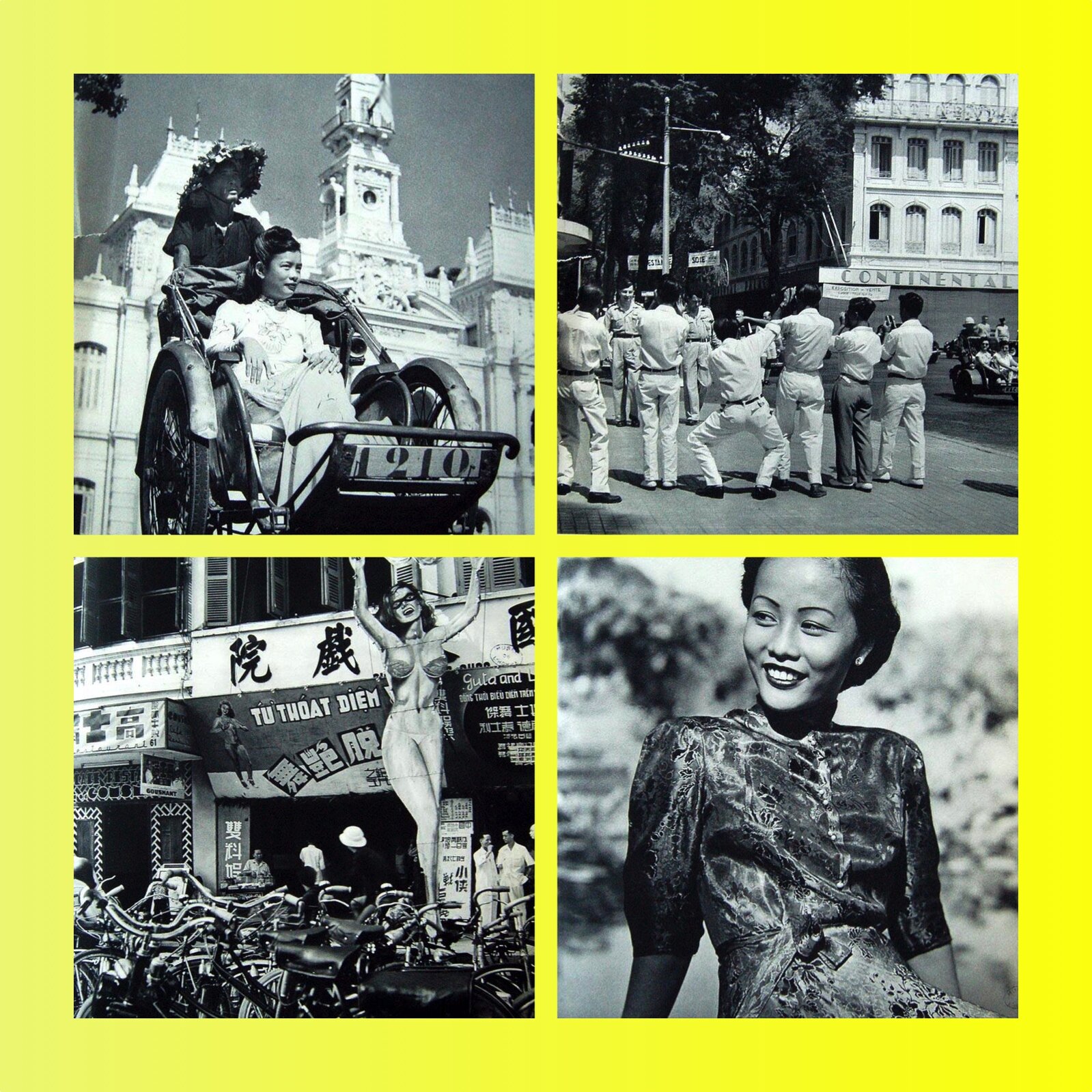 Một góc phố Sài Gòn với rạp hát mang biển quảng cáo khổng lồ cho một tiết mục “thoát y” (striptease). Xung quanh là xe đạp dựng ken đặc, cho thấy đây là một trong những loại hình giải trí hút khách. Bức ảnh gây ấn tượng mạnh vì phơi bày đời sống giải trí phóng khoáng của đô thị Sài Gòn thời Pháp thuộc và đầu thời VNCH.