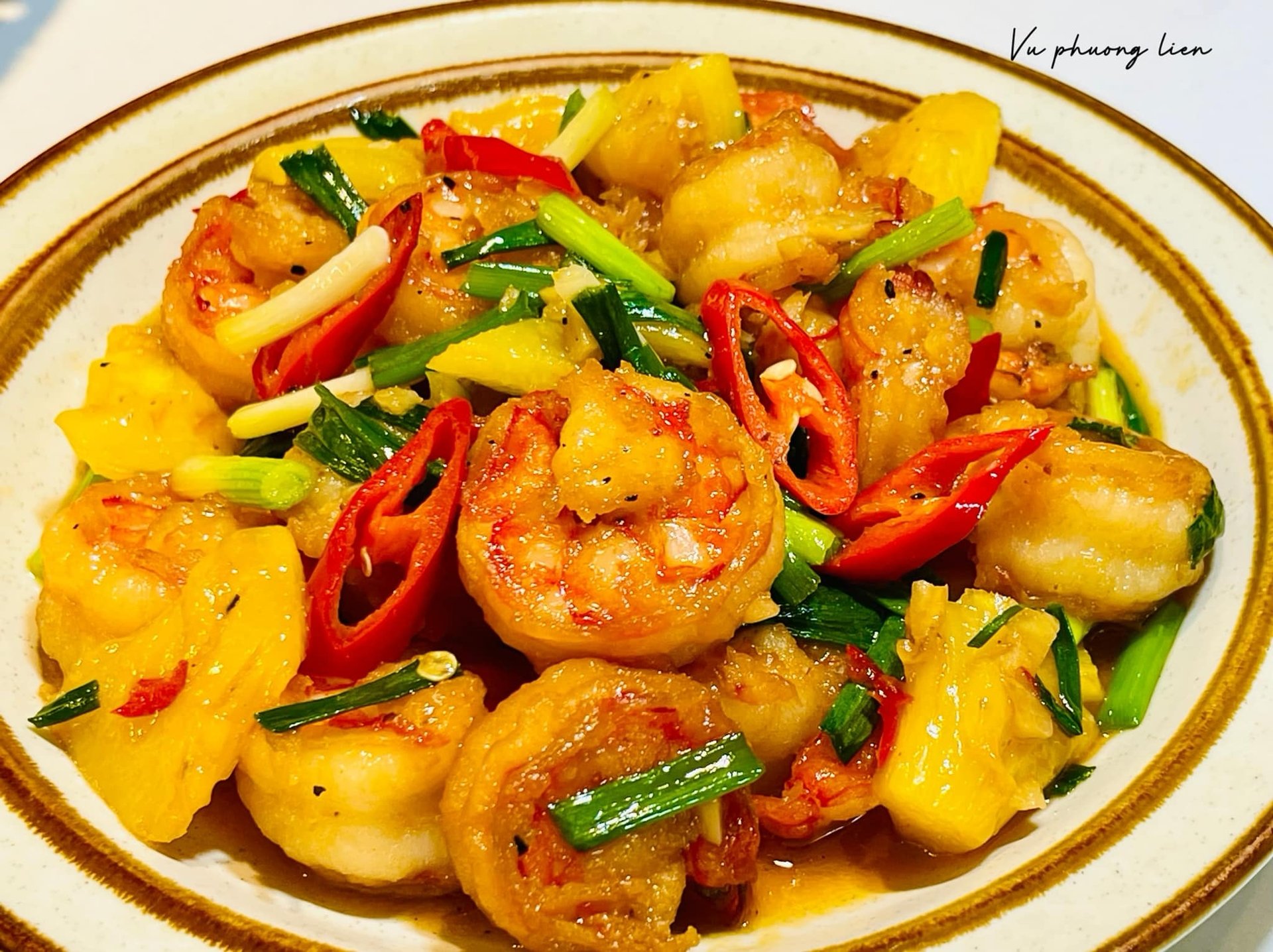 - Cho thêm 1/4 quả dứa, một chút nước đảo nhỏ lửa cho vị dứa ngấm đều vào tôm. Đun tầm 5-7 phút là được. Tắt bếp thêm một chút hành lá vài miếng ớt sừng đảo nhanh tay là hoàn thành.