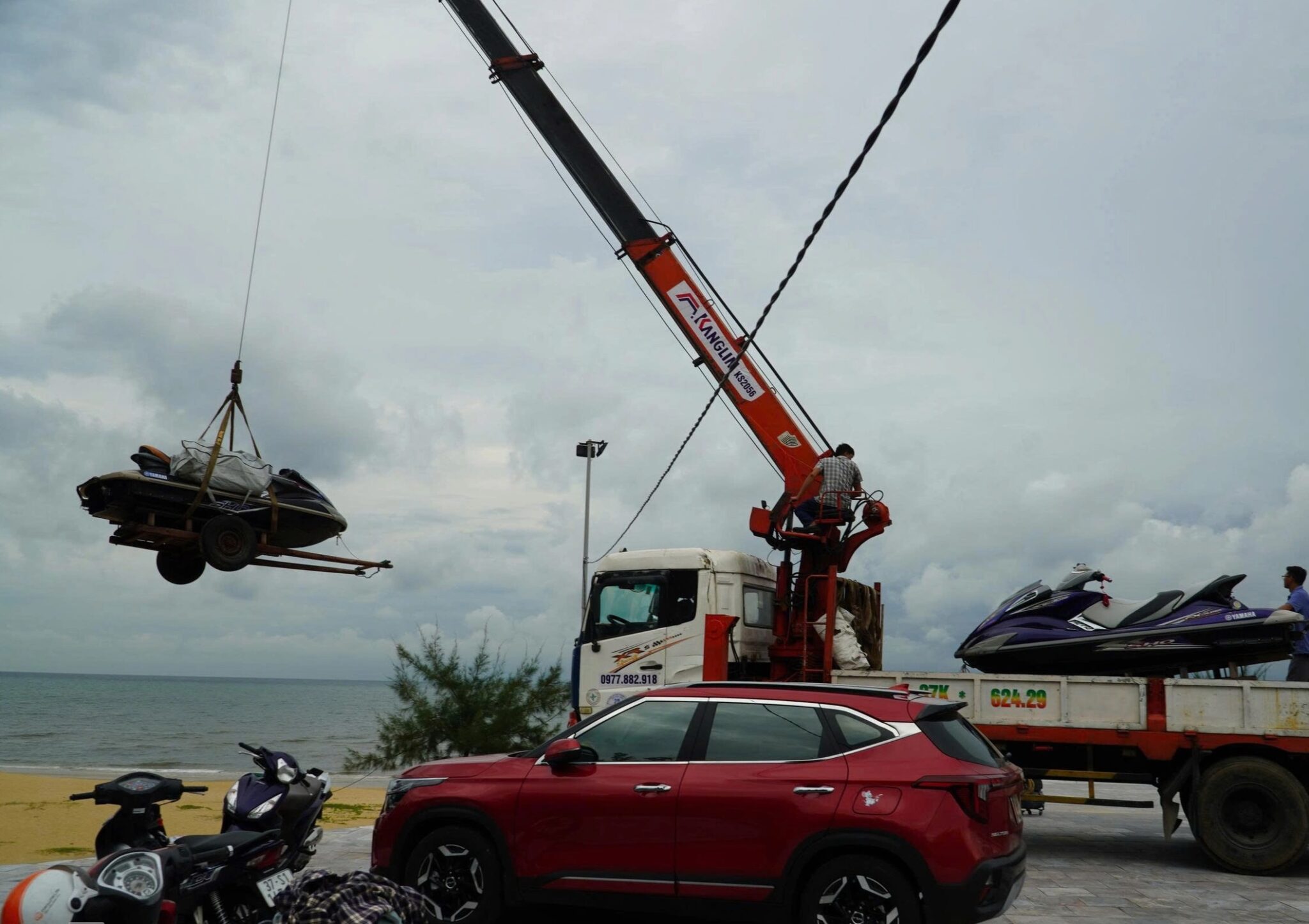 Kéo xe mô tô nước lên bờ tránh bão tại bãi biển Thiên Cầm, tỉnh Hà Tĩnh, vào chiều hôm 24/8. (Ảnh: VNExpress)