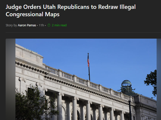 Một thẩm phán Utah đã bác bỏ bản đồ Quốc hội do Đảng Cộng hòa vẽ và ra lệnh cho Cơ quan Lập pháp vẽ lại ranh giới trước cuộc bầu cử giữa nhiệm kỳ năm 2026, giáng một đòn mạnh vào các nhà lập pháp Đảng Cộng hòa và là chiến thắng cho những người ủng hộ chống phân chia khu vực bầu cử.