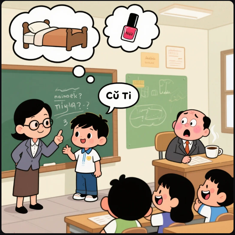 Một pha “trả lời đúng nhưng khiến người lớn sai tư thế” của Cư Tí khiến cả lớp cười nghiêng ngả.