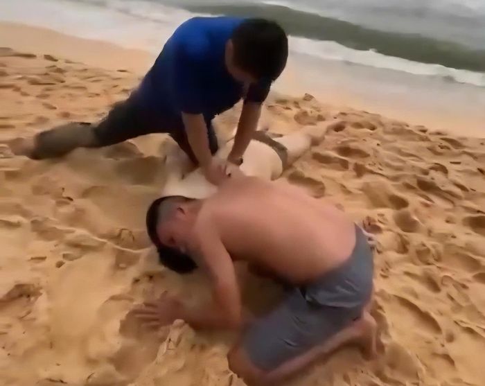 Nam du khách được sơ cứu ngay sau khi được đưa vào bờ. Ảnh: H.B