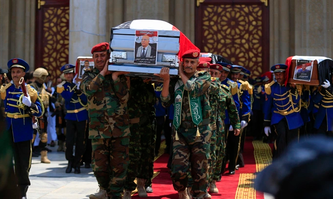 Đội danh dự khiêng linh cữu các thành viên cấp cao của Houthi trong đám tang ngày 1/9 ở thủ đô Sanaa, Yemen. Ảnh: AFP