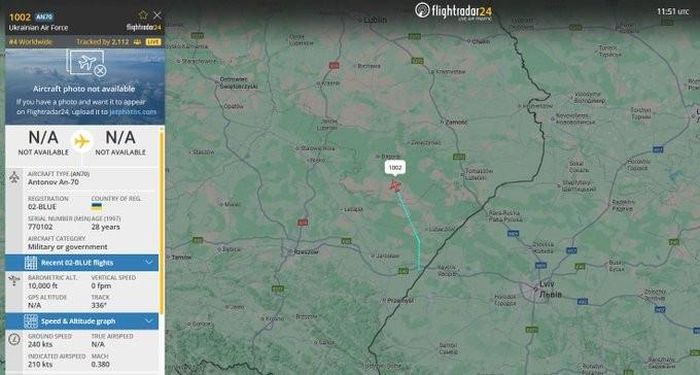 Theo dữ liệu từ Flightradar24, ngày 15/9, máy bay vận tải quân sự An-70 '02 Blue', mang số hiệu 1002 đã bay vào không phận Ba Lan.