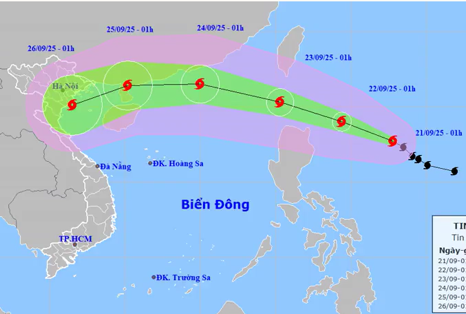 Dự báo hướng đi và khu vực ảnh hưởng của bão Ragasa ngày 21/9. Ảnh: NCHMF