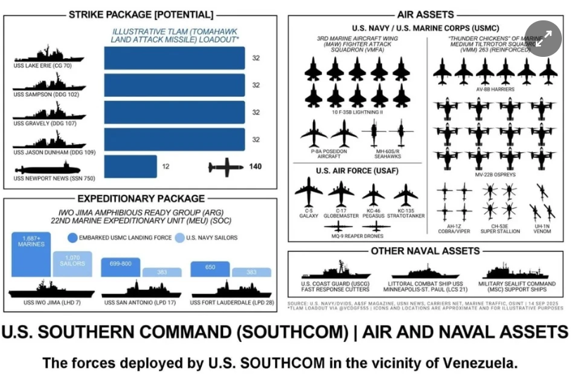 Các lực lượng được Bộ Tư lệnh miền Nam Mỹ triển khai gần Venezuela tính đến ngày 15/9. Ảnh: Mạng xã hội X