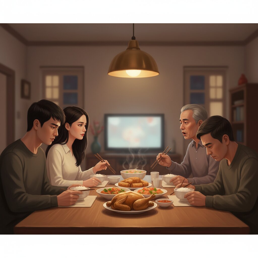 Giữa lúc bố tôi vẫn đang thao thao bất tuyệt về kế hoạch tương lai của anh Long, vợ tôi nhẹ nhàng đặt đôi đũa xuống, một tiếng “cạch” nhỏ nhưng đủ để mọi người chú ý. Cô ấy nhìn thẳng vào bố chồng, giọng nói không hề gay gắt mà lại vô cùng rõ ràng: