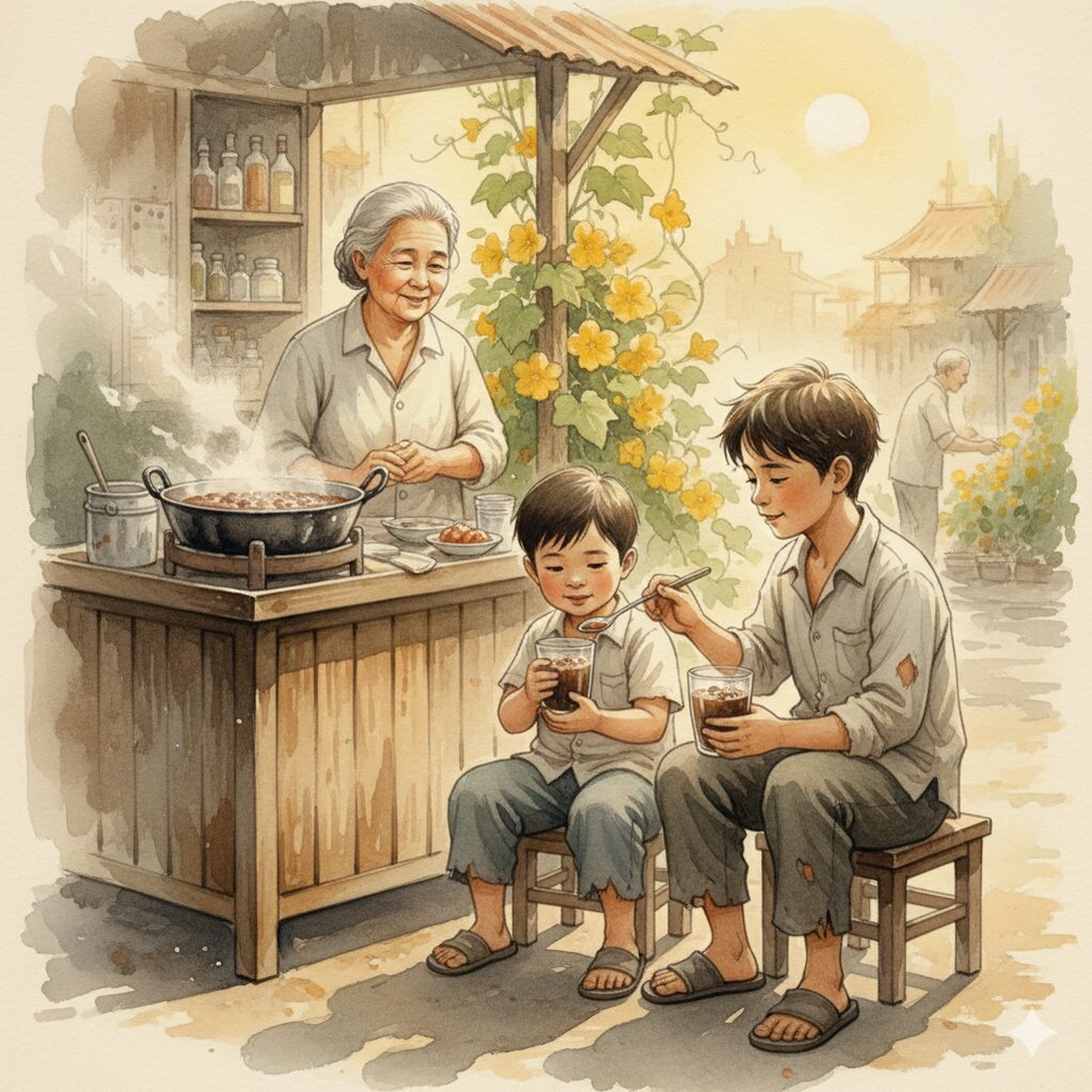 Bởi cái ngọt bùi ấy không nằm trong hạt đậu, trong đường hay nước cốt dừa… mà nằm trong bàn tay gầy guộc của anh, trong tiếng cười hiền hậu của ông – những thương yêu đã hóa thành hương vị vĩnh viễn của ký ức.