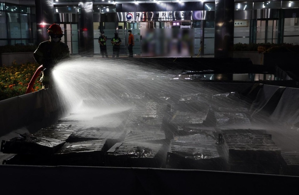 Lính cứu hỏa đang dập tắt đám cháy tại Cơ quan Tài nguyên Thông tin Quốc gia ở Daejeon. Ảnh: Yonhap