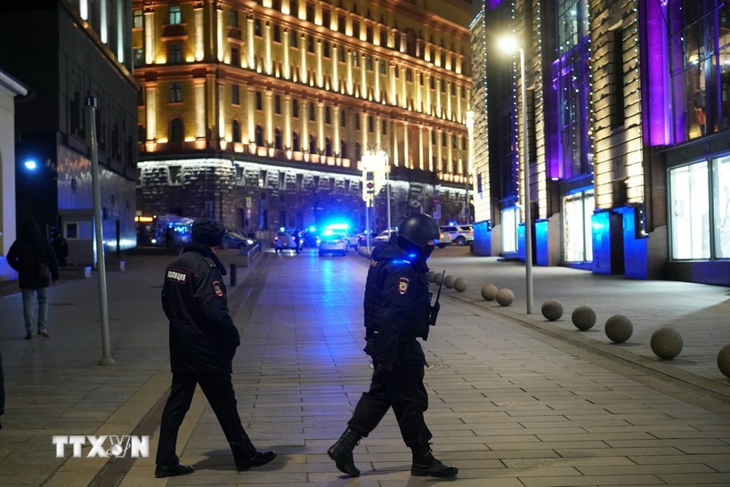 Cảnh sát Nga gác trên đường phố thủ đô Moskva. (Ảnh: AFP/TTXVN)