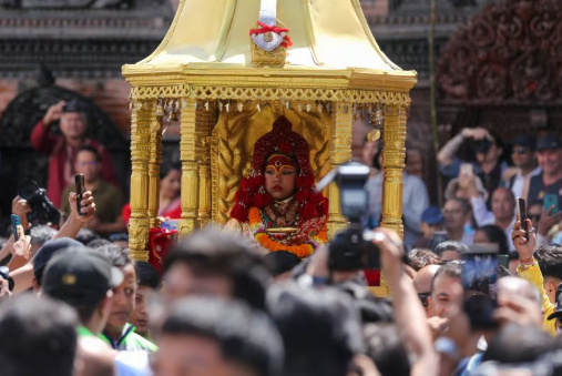 Trishna Shakya, Kumari cũ nay đã 11 tuổi, đã rời đi từ cửa sau trên một kiệu do gia đình và những người ủng hộ cô bé khiêng. Cô bé đã trở thành nữ thần sống vào năm 2017.