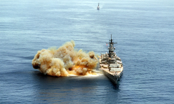 Thiết giáp hạm USS Iowa khai hỏa trên biển năm 1985. Ảnh: US Navy