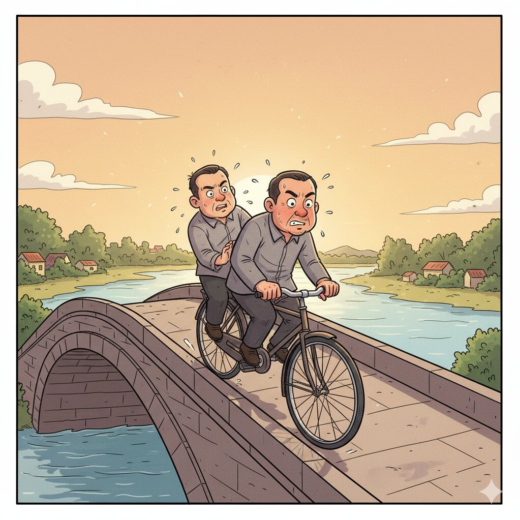 – Mày đạp cực chứ tao lái cũng khổ lắm! Tao sợ tụt dốc nên… bóp thắng suốt từ nãy đến giờ!