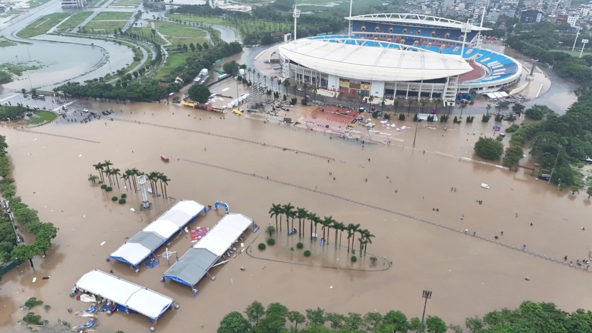 Người dân giống như đang bơi trong dòng nước ngập mênh mông như sông ở quảng trường trước sân vận động Mỹ Đình, Hà Nội. (Ảnh: Văn Ngọc/VNExpress)