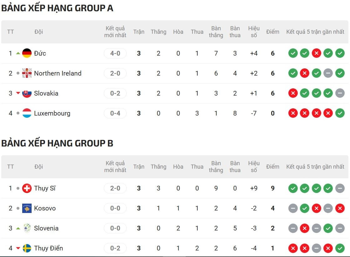 BXH vòng loại World Cup 2026 khu vực châu Âu. Ảnh: 24h.