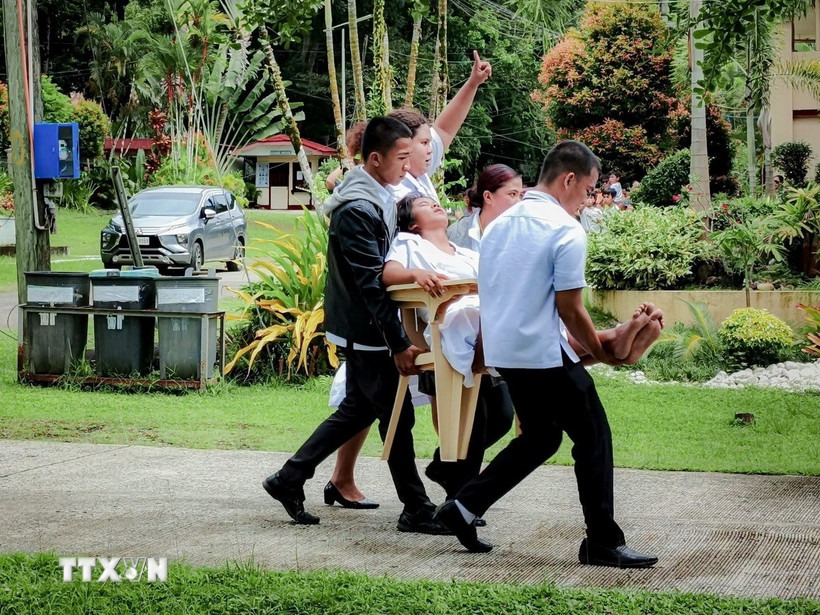 Chuyển người bị thương sau trận động đất tại tỉnh Agusan Del Sur, Philippines, ngày 10/10/2025. (Ảnh: THX/TTXVN)