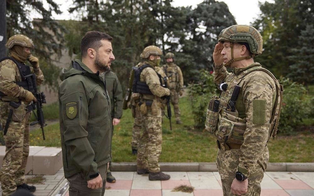 Quân nhân Ukraine báo cáo với Tổng thống Zelensky. Ảnh: Zuma press.