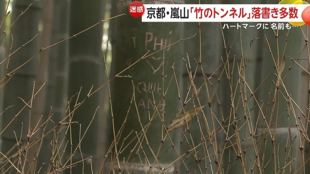 Khoảng 350 cây trên con đường tre nổi tiếng ở Kyoto bị du khách khắc chi chít chữ lên thân, khiến cây giảm khả năng quang hợp, dễ chết.