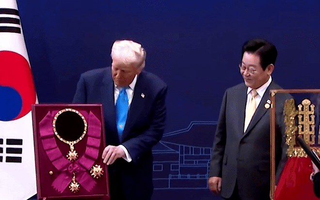 Tổng thống Mỹ Donald Trump đã được Tổng thống Hàn Quốc Lee Jae Myung trao tặng Huân chương Đại Hòa Mugunghwa và bản sao vương miện vàng Cheonmachong – món quà mang tính biểu tượng cao, gắn liền với quyền lực thiêng liêng và thông điệp hòa bình trên bán đảo Triều Tiên, CNN đưa tin.