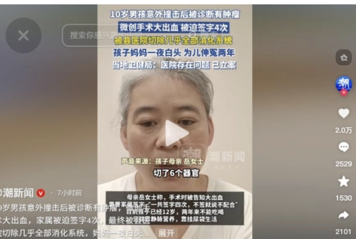 Một vụ việc gây sốc về sai sót y khoa xảy ra tại Hà Trạch, tỉnh Sơn Đông, đang gây phẫn nộ trên mạng xã hội Trung Quốc. Theo một bài đăng từ gia đình nạn nhân, một bé trai 12 tuổi đã không thể ăn uống sau một ca phẫu thuật mà các bác sĩ mô tả là "thường quy" để cắt bỏ một khối u bụng.