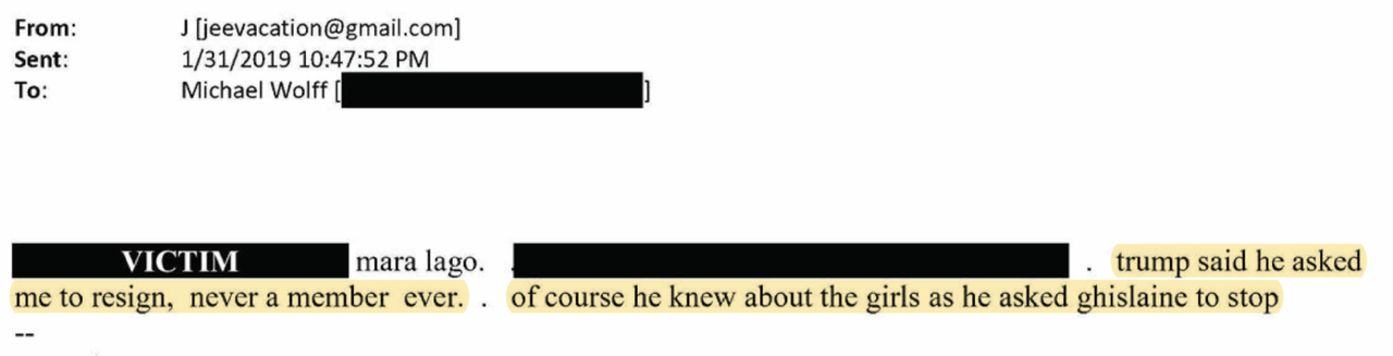Theo như trong số các email mới đây đã được tiết lộ, lại có tin nhắn của Jeffrey Epstein — tội phạm ấu dâm đã tự sát trong tù khi khẳng định Tổng thống Donald Trump “biết về những cô gái ấy” — dường như ám chỉ câu chuyện Donald Trump từng khoe rằng ông trục xuất Epstein khỏi câu lạc bộ Mar-a-Lago vì chiêu dụ các cô gái trẻ làm việc ở đó, sau khi ủy ban Giám sát Hạ viện mới đây đã công bố thêm 20.000 trang tài liệu mà ủy ban do Đảng Cộng hòa lãnh đạo nhận từ di sản của Jeffrey Epstein.
