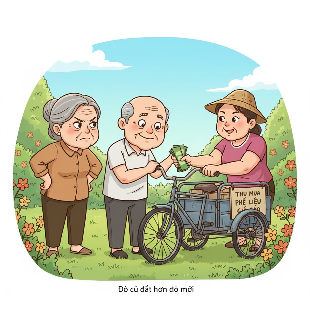 Tôi nhìn theo bà vợ cười thầm, trong lòng nghĩ: Một con người là đồ bỏ đi bán 100 triệu mà bà không bán, chẳng trách quảng cáo trên tivi thường nói là: Đồ cũ đắt hơn đồ mới ! Cũ của người nhưng là mới của ta …