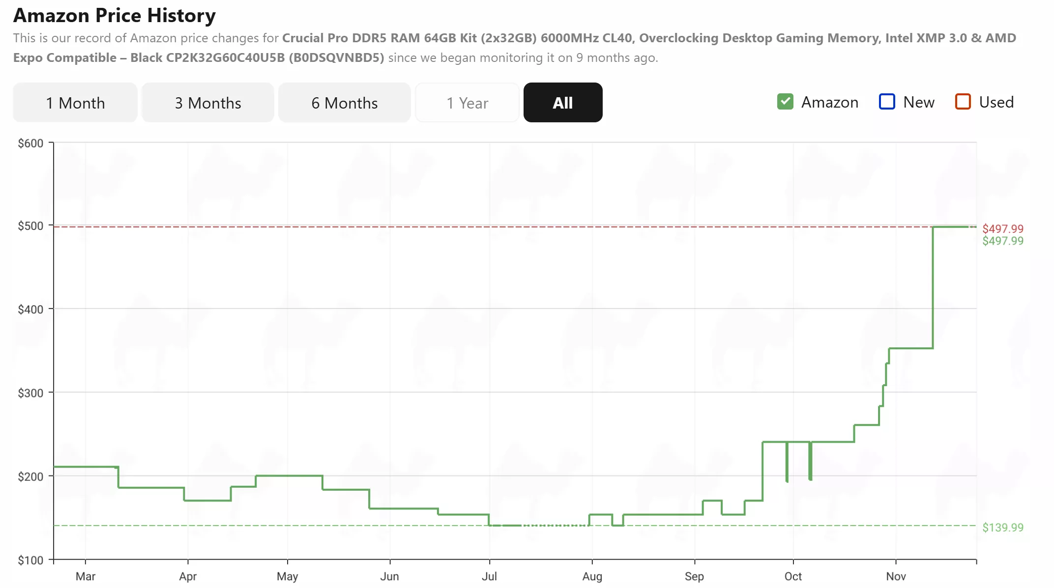 Câu chuyện này cũng xảy ra tương tự ở những nơi bán khác. Ứng dụng theo dõi sản phẩm CamelCamelCamel của Amazon cho thấy RAM Crucial Pro DDR5 6000 64 GB chỉ có giá 139 USD từ tháng 7 đến tháng 8. Hiện tại, giá bán của nó là 497 USD, tăng đến 257,5%.