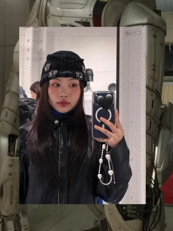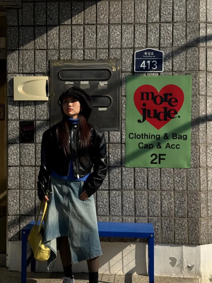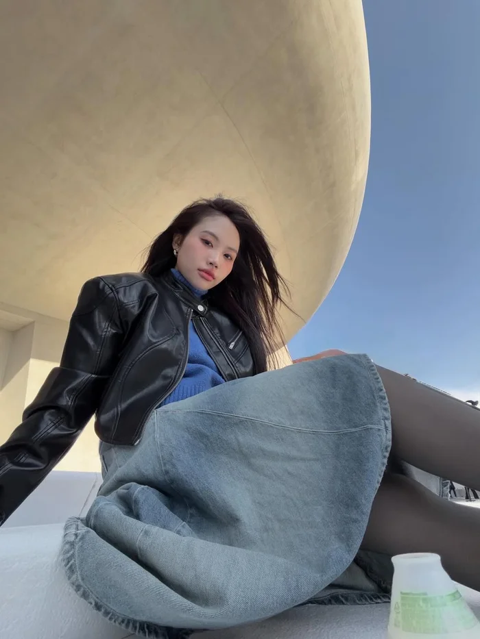 Trong loạt ảnh này, Phương Mỹ Chi xuất hiện với chiếc áo khoác da đen dáng ngắn, kết hợp cùng áo len xanh nổi bật và chân váy jean dài bất đối xứng, tạo tổng thể vừa cá tính vừa thời thượng. Những phụ kiện đi kèm như mũ lông đen, túi xách nhỏ giúp tạo thêm điểm nhấn cho tổng thể trang phục. Đây là hình ảnh khác hẳn với vẻ dịu dàng, thướt tha mà khán giả quen thấy trên sân khấu.