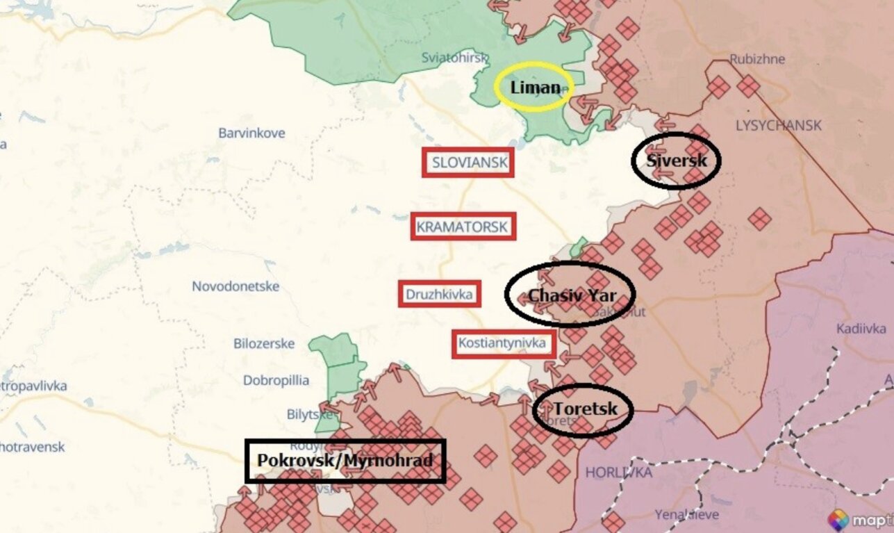 Theo Đại tá Lực lượng Vũ trang Ukraine Vladislav Seleznev nói trong một bài bình luận với RBC-Ukraine, bốn thành phố lớn vẫn nằm dưới sự kiểm soát của quân đội Ukraine đang là đích ngắm của Nga tính từ nam lên bắc gồm: Konstantinovka, Druzhkovka, Kramatorsk và Sloviansk.