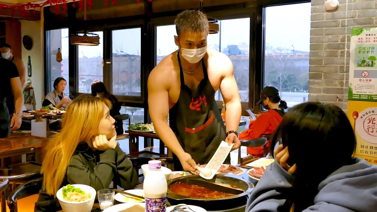 Trái ngược với sự nhẹ nhàng đó, chuỗi lẩu Cheng Dieyi ở Thành Đô hay một nhà hàng lẩu tại trung tâm thương mại Thai Moe Mall ở Shijiazhuang gây sốt Douyin bằng đội hình nhân viên nam lực lưỡng, cởi trần và sẵn sàng tạo dáng cùng khách. Trong nhiều video lan truyền, thực khách còn vừa ăn vừa chấm điểm ngoại hình từng người.