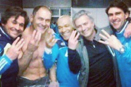 Mourinho và các cộng sự ăn mừng chiến thắng của Real Madrid theo cách rất “kích động”