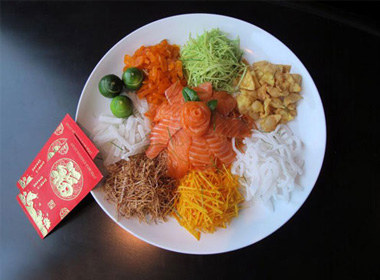 Yu sheng - salad Xuân Như Ý là món gỏi thường được làm từ cá sống thái lát, rau củ nạo, vừng bột, nước sốt mận… Trong tiếng Hoa, cá sống mang ý nghĩa cuộc sống thịnh vượng, từng nguyên liệu của món gỏi cá cũng tượng trưng cho mong ước có được sự sung túc, may mắn, thành công trong năm mới.