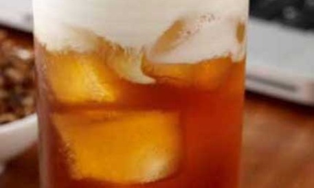 Rót ít trà ra ly, thêm tí mật ong vào hòa tan. Thêm nha đam, đá và ít sữa tươi.