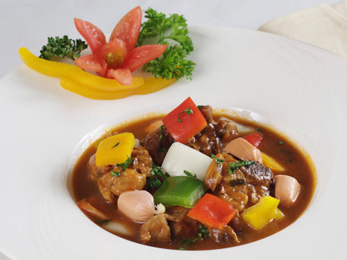 Bò rửa sạch cắt miếng vừa ăn. Ướp thịt bò với tỏi, tiêu, muối, đường bột nêm để thấm. Phi thơm tỏi cho bò vào xào. Cho nước vào nấu bò, sau khi sôi hạ lửa nấu liu riu, sau đó cho vang đỏ vào hầm tiếp cho đến khi thịt bò mềm hẳn. Nêm lại cho vừa ăn, cho ớt chuông, hành tây, vào nấu thêm ba phút. Bò nấu vang đỏ ăn với bánh mì.