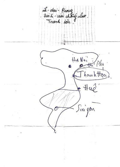 Bản đồ Việt Nam mà Michel nhờ người vẽ để tìm cha. Ảnh: Lê Hoàng chụp lại.