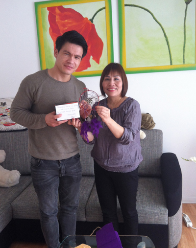 Bà Ngọc Điệp trao cho Michel Weiland món quà là những chiếc dreamcatcher của các em gái gửi từ Việt Nam sang. Ảnh: NVCC.