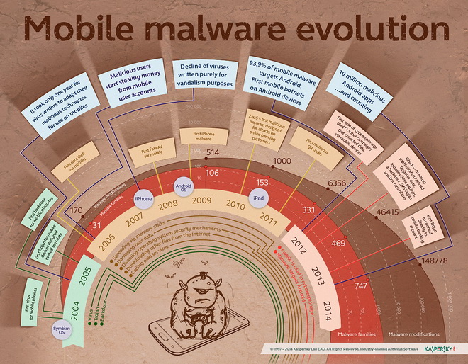 Đáng chú ý, con số gần 145.000 chương trình độc hại (malware) mới được phát hiện trong năm 2013, gấp 3 lần con số của năm 2012 (40.059 mẫu) cho thấy các nền tảng di động và sự bùng nổ của thiết bị di động gồm smartphone và tablet đã trở thành mục tiêu lớn của giới tội phạm. Tính đến tháng 1-2014, bộ tập hợp mã độc của Kaspersky Lab đã có 190.000 mẫu mã độc di động.