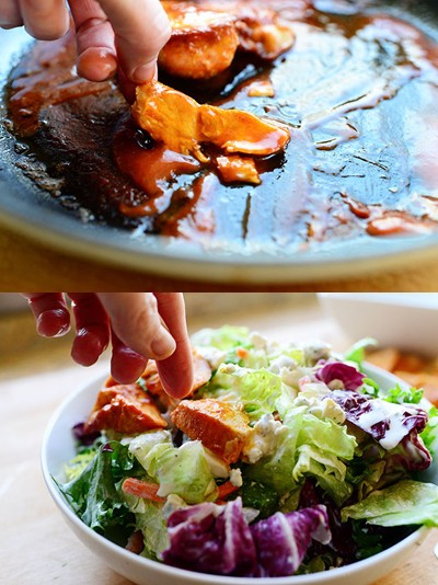 Cuối cùng bạn cho gà vào cùng các loại rau cải để hoàn thành món salad gà. Nếu muốn gà có vị đậm hơn bạn có thể quết các miếng gà qua tương ớt một lần nữa nhé!