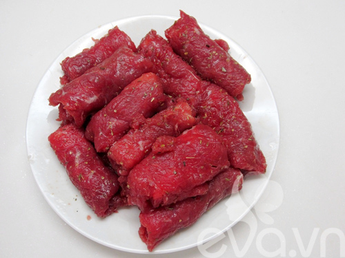 Bước 1: Ướp thịt bò với 2 muỗng cà phê muối, 4 muỗng cà phê đường, 2 muỗng cà phê gia vị Ialian herbs mix, 2 muỗng cà phê bột bắp. Trộn đều, để khoảng 15-20 phút cho thịt ngấm gia vị.