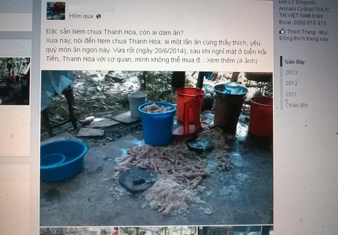 Trên trang Facebook cá nhân của một người có nickname L.X.H vừa xuất hiện bài viết khá chi tiết kèm theo một số hình ảnh ghi lại quy trình sản xuất nem chua và hải sản ở một số cơ sở chế biến tại Thanh Hóa. Với tiêu đề bài viết "Đặc sản Nem chua Thanh Hóa, còn ai dám ăn?", người này ghi lại hình ảnh và thông tin thu thập được sau khi nghỉ mát ở bãi biển Hải Tiến (Thanh Hóa) cuối tuần trước.
