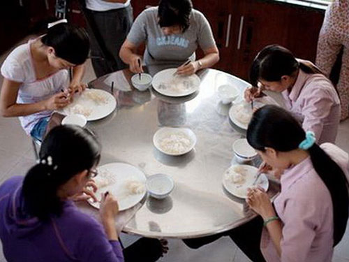Cách “dọn” tổ yến nghe thì đơn giản nhưng thao tác lại khá phức tạp mà chỉ những người thợ chuyên nghiệp mới làm được. Khu vực gia công của anh Minh được bố trí riêng biệt trên 2 tầng lầu của căn nhà và được giao cho những người thợ “ruột” hoặc con cháu để không lộ bí quyết. Theo đó, tổ yến được ngâm nước cho nở tung ra rồi cho dầu ăn vào chà xát nhưng không để sợi yến bị gãy vụn, còn các loại tạp chất sẽ bám vào dầu nổi trên mặt nước. Sau khi làm sạch chất bẩn, tổ yến được tẩy trắng bằng hóa chất. Kế tiếp, nhóm thợ dùng một số nguyên liệu có bề ngoài giống tổ yến như mủ trôm, rau câu trộn thêm vào. Cuối cùng là công đoạn “thêu tổ”. Trên các tổ yến thật, người thợ khéo léo dùng nhíp gắp từng sợi yến đan lẫn với mủ trôm và rau câu để “dệt” thành một tổ yến sào hoàn chỉnh theo một tỉ lệ định sẵn: 20%, 50% hoặc 70% yến nguyên chất. Những tổ yến này sau đó được đóng hộp rất bắt mắt để tung ra thị trường.